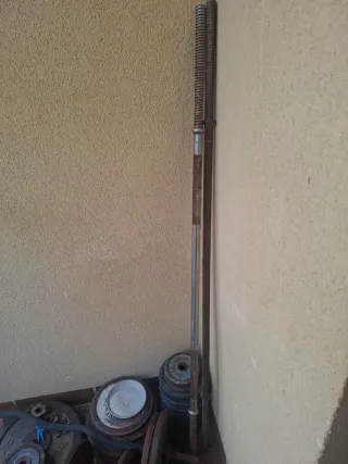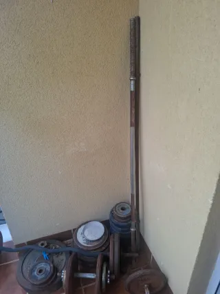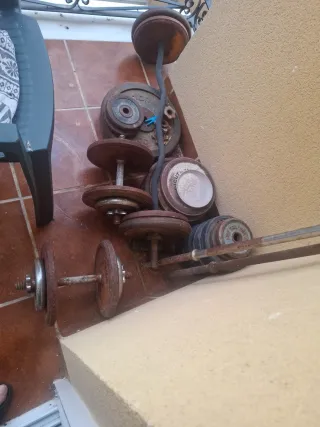 Conjunto de pesos y barras para entrenamiento en casa. Presentan signos de óxido debido al almacenamiento. - Variedad de discos de diferentes pesos. - Barras para ejercicios. - Ideal para quienes buscan equipamiento funcional.