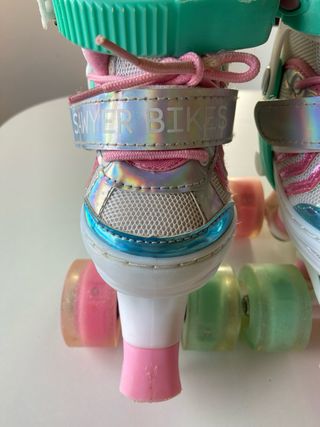 Patines infantiles de la marca Sawyer Bikes, ajustables de la talla 24 a la talla 27. Fáciles de poner y de llevar. Los patines están nuevos, tienen luces en las ruedas y un velcro para terminar de ajustarlos.