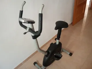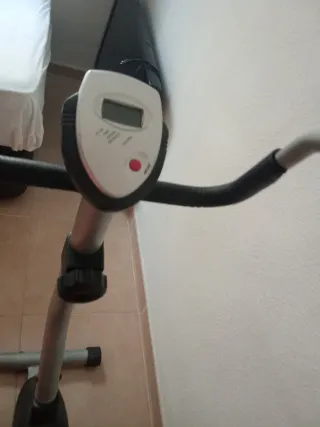 Bicicleta estática para entrenar en casa. Cuenta con una pantalla digital para seguir tu progreso. - Pantalla con información de tiempo, distancia, velocidad y calorías. - Botón de modo para cambiar la información mostrada. - Diseño compacto y funcional.