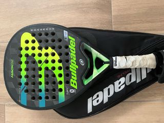 Pala de pádel Bullpadel HACK02 en buen estado. - Diseño moderno con detalles en verde y amarillo. - Incluye funda protectora.
