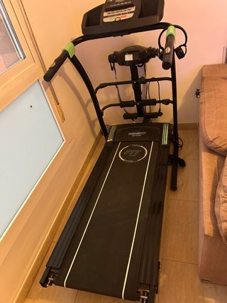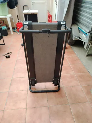 Cinta de andar compacta, ideal para mantenerte activo en casa. - Diseño plegable para fácil almacenamiento. - Superficie de carrera gris. - Pasamanos negros para mayor seguridad.