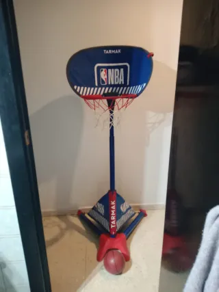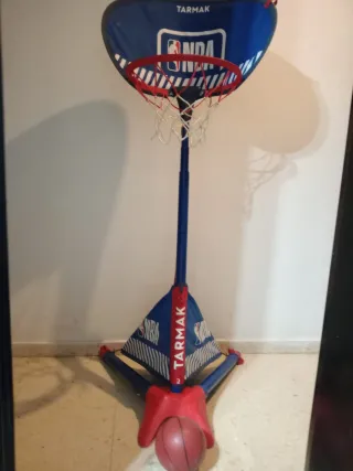 Canasta de baloncesto Tarmak con licencia oficial de la NBA, ideal para los más pequeños. Se pliega fácilmente para guardarla. - Aro rojo con red blanca. - Base estable con soporte. - Incluye una pelota de baloncesto.
