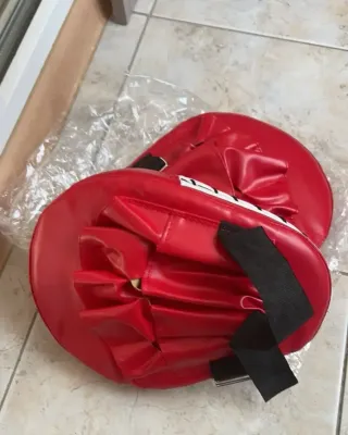 Par de manoplas de boxeo rojas, perfectas para entrenamiento. Son dos unidades y están completamente nuevas, sin estrenar. - Color: Rojo - Material: Cuero sintético - Cierre ajustable para la mano