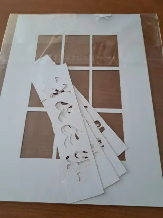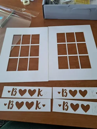 Set de adornos para scrapbooking y manualidades. - Dos marcos blancos con diseño de ventana. - Tiras decorativas con letras y corazones.