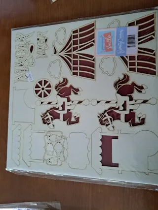 Set de adornos para scrapbooking con temática de carrusel y helados. - Piezas troqueladas en cartulina. - Diseños de caballos, carrusel, nubes y helados. - Ideal para proyectos de manualidades y decoración.