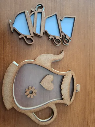 Adorno de madera para scrapbooking con diseño de taza. - Detalle de flor y corazón. - Material de madera. - Ideal para manualidades y decoración.