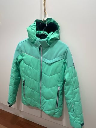 Anorak de esquí para niña de la marca CMP. Diseñado para ofrecer comodidad y protección en la montaña. - Color verde menta. - Capucha extraible. - Cierre de cremallera frontal. - Bolsillos laterales con cremallera. - En perfecto estado