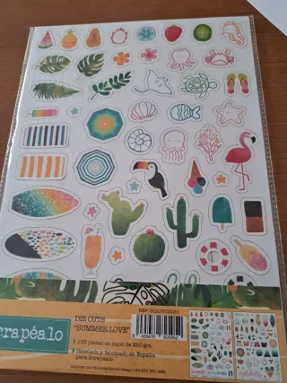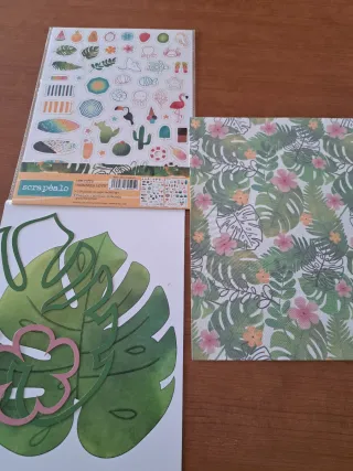 Set de materiales para scrapbooking con temática tropical. - Láminas con diseños de hojas tropicales y flores. - Hoja de pegatinas con motivos veraniegos: flamencos, cactus, tablas de surf, etc. - Diseños de la marca Scrapésio.