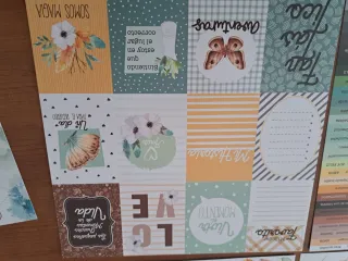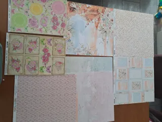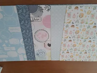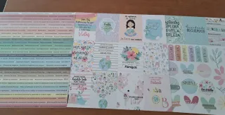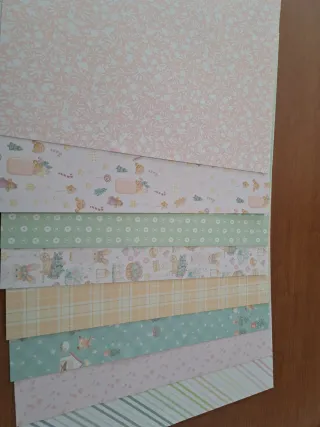 Lote de papeles para scrapbooking con diseños variados. - Diseños florales en tonos rosas y verdes. - Patrones abstractos y texturizados. - Ideal para manualidades y proyectos creativos.
