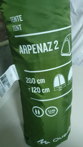 Tienda de campaña Arpenaz 2, ideal para dos personas. - Dimensiones: 200 cm x 120 cm. - Peso: 2,4 kg. - Color verde.