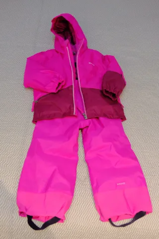 Conjunto de esquí de dos piezas para niña, en llamativo color rosa. - Chaqueta con capucha y cremallera frontal. - Pantalón de esquí. - Detalle de color burdeos en la chaqueta y mangas. - Tirantes en los bajos del pantalón.