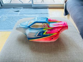 Carrocería pintada para coche RC Mugen MBX8. Diseño llamativo con colores vibrantes. - Carrocería pintada a mano. - Colores: azul, blanco, rosa y amarillo. - Acabado brillante.
