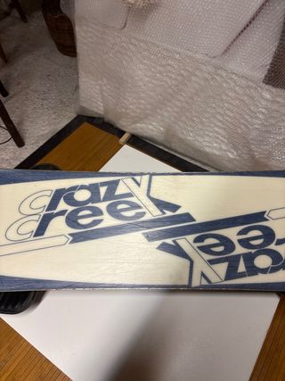 Tabla de snowboard con un diseño llamativo en azul y blanco, lista para la nieve. - Incluye fijaciones. - Diseño con detalles en rojo y blanco. Se puede aprovechar la tabla, pero las fijaciones se tienen que cambiar, estan rotas