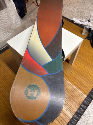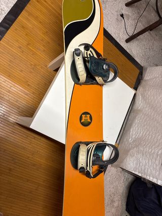 Tabla de snowboard con un diseño llamativo en color naranja y detalles gráficos. - Fijaciones incluidas. - Diseño con forma de 'H' en el centro.