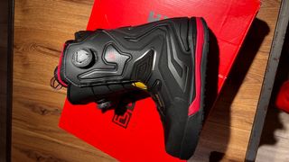Botas de snowboard negras con detalles en rojo y cordones de color azul brillante. Perfectas para disfrutar de la nieve con estilo y comodidad. - Marca: ThirtyTwo - Modelo: TM-2 - Color: Negro con cordones turquesa - Cierre: Cordones