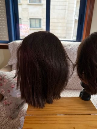 Cabeza de maniquí para prácticas de peluquería y estética. Incluye un soporte. Son dos cabezas sirven tanto para peinar como para maquillar. Ambas: -Pelo natural muy bueno. - Color de cabello castaño muy abundante. -Una largo medio y otra mas corto. Por las dos serian 25 euros, si solo compra una 15 euros.