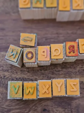 Conjunto de sellos de madera con letras del abecedario. - Incluye letras A-Z.Estrella,Corazón e interrogación - Base de madera. - Superficie de goma con relieve.