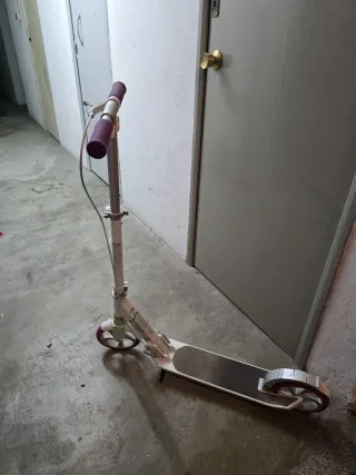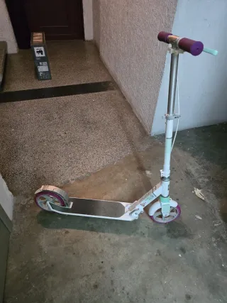 Patinete plegable con manillar ajustable y ruedas de goma. Precio 27€ - Color: plateado y morado. - Plataforma antideslizante. - Frenos en la rueda trasera.