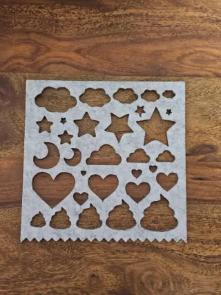 Set de seis plantillas de fieltro con diferentes diseños. - Incluye formas de nubes, estrellas, lunas, corazones y cacas. - Material de fieltro ligero y flexible. - Ideales para proyectos de manualidades y decoración.