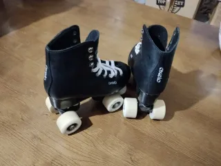 Patines de la marca Oxelo en color negro y talla 35. Perfectos para iniciarse en el patinaje. - Cierre con cordones blancos. - Ruedas blancas.