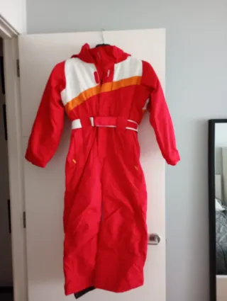 Mono de esquí o nieve de color rojo, ideal para mantenerse abrigado y seco en la montaña. Presenta detalles en blanco y naranja en la parte superior. - Diseño de una sola pieza. - Cinturón ajustable. - Capucha integrada.