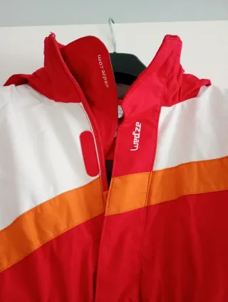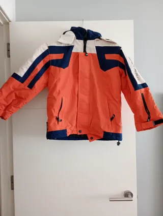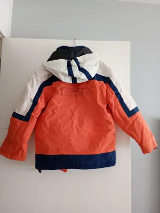 Chaqueta de nieve o esquí con un diseño llamativo en naranja, azul y blanco. Perfecta para actividades al aire libre en climas fríos. - Mangas con detalles en azul y blanco. - Bolsillos frontales con cremallera. - Cuello alto con capucha.
