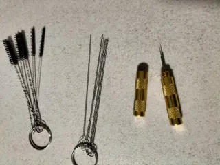 Kit de limpieza para aerógrafo que incluye varios accesorios. - Juego de cepillos de limpieza. - Juego de agujas de limpieza. - Mango dorado con punta fina.
