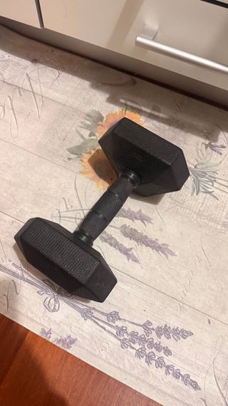 Mancuerna hexagonal de 15 kg, ideal para entrenamientos de fuerza. - Peso: 15 kg - Diseño hexagonal para mayor estabilidad - Revestimiento de goma en las pesas - Agarre moleteado para un mejor control