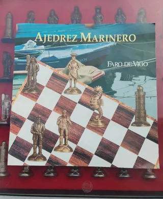Set de ajedrez temático Ajedrez Marinero con piezas inspiradas en el mar y el puerto de Vigo. - Tablero de ajedrez con diseño de madera. - Piezas de ajedrez metálicas con figuras de marineros, faros y criaturas marinas. - Incluye el título Faro de Vigo. - Parte trasera de Metacrilato Medidas del tablero 30 x 30 cm -Figuras de Metal medidas desde 4,4cm a 5,5 cm Peso de cada pieza entre 25 y 30 gr -Sin Uso. -Ennpeefecro estado -Peso total 2,2 kg -Venta en mano -Año 2010