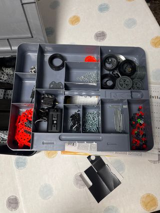 Caja de construcción Mekano con diversas piezas. - Incluye ruedas, tornillos, tuercas y varillas. - Piezas de plástico rojas y negras. - Contiene elementos metálicos y de plástico.