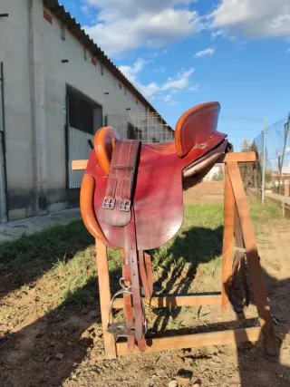 Montura española de cuero en tono rojizo, usada pero en perfectas condiciones, parece recién comprada, tal y cuál se aprecia en las fotos. - Estribos metálicos. - Cincha de cuero Medidas por privado. ⚠️ESCUCHO OFERTAS⚠️