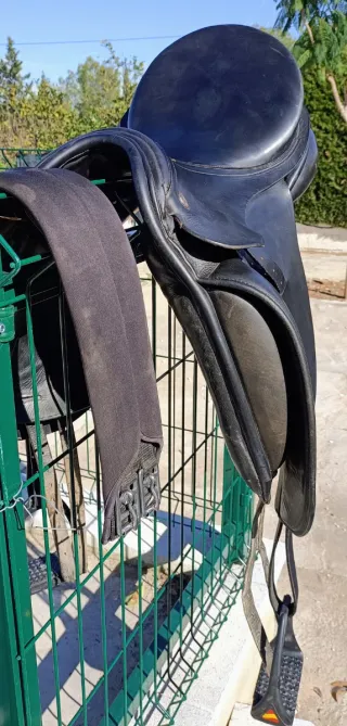 Montura de doma clásica de la marca KN, modelo TANGO. - Color negro. - Material de cuero. - Diseño de doma. - Completa con acciones, estribos y cincha - Medida 17,5