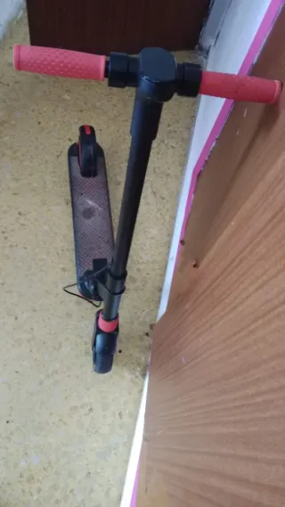 Patinete eléctrico con manillar plegable y empuñaduras rojas. - Manillar con empuñaduras rojas. - Diseño plegable para fácil transporte. - Rueda delantera y trasera visibles.