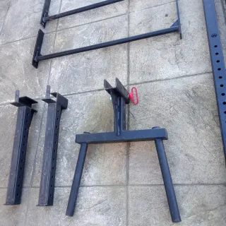 Conjunto de estructura de pared para gimnasio. - Las barras largas miden 2'77m - 3 Barras de dominadas - Soportes para barra - Seguros para sentadilla y banca - Barras de fondos - Base con soporte estructura que se conserva en perfecto estado tras haber sido usada 5 meses, muy estable para realizar halterofilia pesada, dominadas o muscle ups lastrados, press banca pesado y fondos con lastre.