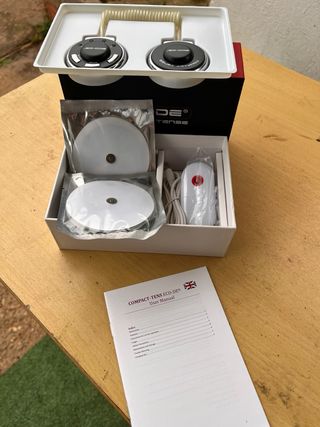 Electroestimulador ECODE Compact Tense en su caja original. - Incluye dos unidades. - Diseño circular con botones. - Cable en espiral.
