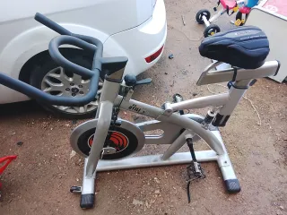 Bicicleta estática plateada, ideal para entrenamientos en casa. - Manillar ergonómico. - Sillín acolchado. - Pedales con agarre.