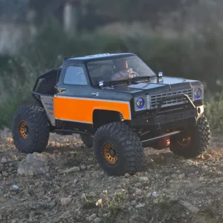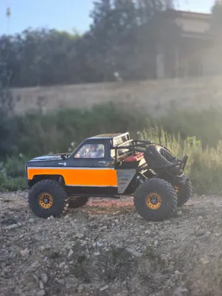 Este es un Axial SCX6 Honcho, un vehículo radiocontrolado. - Diseño de camión todoterreno. - Neumáticos de gran tamaño para terrenos difíciles. - Ruedas con detalles dorados. - Jaula antivuelco en la parte trasera.