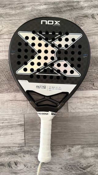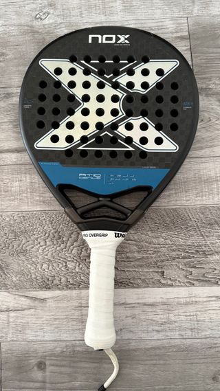 Pala de pádel Nox AT10 12K modelo 2024. Diseñada en España. - Acabado en carbono 12K. - Marco de carbono. - Goma Black EVA. Tiene saltos de pintura únicamente de algún golpe contra la valla metálica, por el resto está bien, usada únicamente 1 mes.