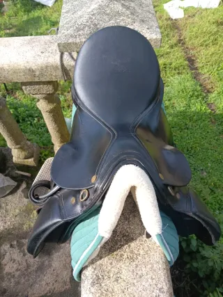 montura para caballo de doma clásica en buen estado,incluye acciones y estribos - Material: Cuero negro. - Estribos metálicos.