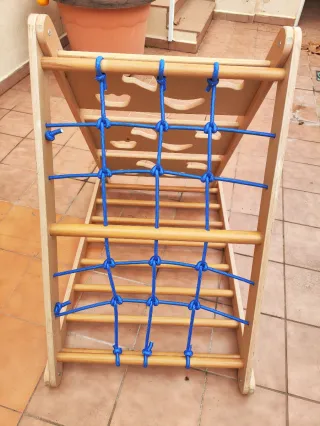 Estructura de madera para jugar y escalar. - Tobogán integrado. - Rampa de escalada con agarres de colores. - Diseño de madera natural.