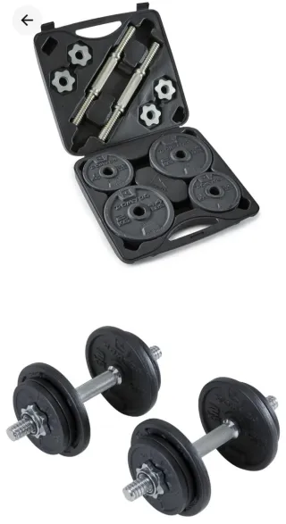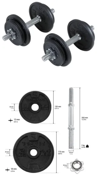 Kit de mancuernas de 20kg con su caja original para guardarlas y transportarlas fácilmente. - Incluye dos barras cortas para mancuernas. - Incluye 4 discos de 2 kg. - Incluye 8 discos de 1kg. - Incluye 4 cierres de estrella - mancuerna de 2kg
