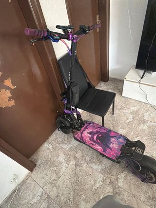 Patinete eléctrico Dualtron Thunder 2 con asiento. - Diseño deportivo y llamativo. - Manillar con puños morados. - Pantalla digital en el manillar. - Plataforma con diseño gráfico. - Asiento negro acolchado.