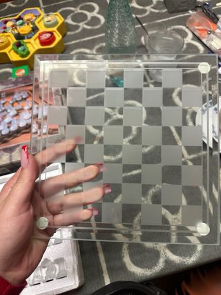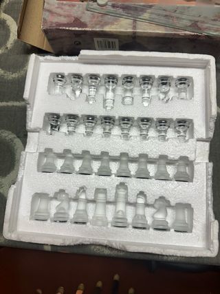 Elegante juego de ajedrez con piezas de cristal transparente y esmerilado. Perfecto para coleccionistas o como pieza decorativa. - Piezas de cristal de alta calidad. - Diseño moderno y sofisticado. - Incluye todas las piezas necesarias para jugar.