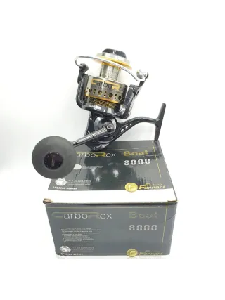 Carrete Carbo Rex Boat 8000 de Fishing Ferrari con 8 rodamientos de acero inoxidable, Freno de 18 kg, doble bobina metálica refrígerada, cuerpo y rotor de aluminio de alta resistencia, engranajes de acero inoxidable, tratamiento anti salitre, rotor de carbono reforzado, Pomo de combate sobredimensionado muy cómodo ideal para luchar con los más grandes - 7+1 rodamientos SS. - Serie especial.