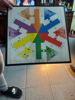 Tablero de parchís con diseño colorido y clásico. Ideal para partidas divertidas en familia o con amigos. - Diseño de 4 colores: azul, amarillo, rojo y verde. - Pistas numeradas para el recorrido.