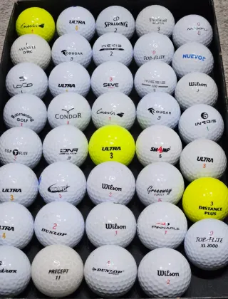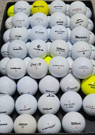 60 bolas de golf de diferentes marcas y modelos. Algunas son amarillas y otras blancas. En buen estado sin cortes ni deformaciones. - Incluye marcas como Dunlop, Wilson, Inesis, Martin, Pinnacle, Slazenger, Maxfli, Precept, Top Flite, Greenway, B-Square, Deep Red. - Varios números visibles: 0, 1, 2, 3, 4, 5, 11, 33. - Modelos como Revelation, Loco, , Smartcore, Titanium.