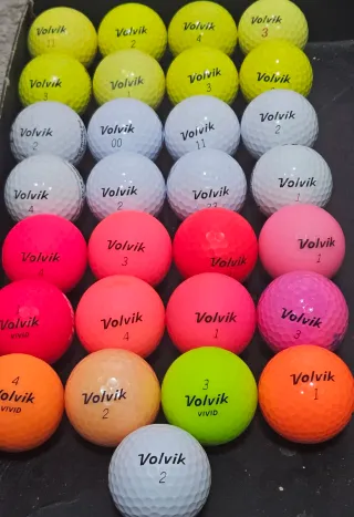 30 bolas de golf de la marca Volvik en varios colores y números, en buen estado, sin cortes ni deformaciones. - Bolas de golf Volvik. - Colores: Amarillo, blanco, rosa, naranja, verde y morado. - Números: 00, 1, 2, 3, 4, 11, 22, 23. - Algunas bolas incluyen la inscripción VIVID.