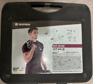 Kit de mancuernas Decathlon de 20 kg (44 lb). - Incluye 2 barras, 8 discos (4x 2kg, 4x 1kg) y 4 cierres. - Ideal para entrenamientos en casa.