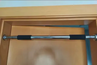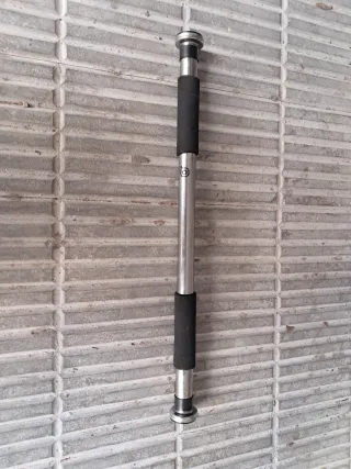 Barra de dominadas para puerta, fácil de instalar y usar. - Material: Metal y goma. - Color: Plateado y negro. - Longitud ajustable.