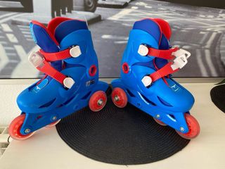 Patines en línea ajustables para niños y niñas. - Talla 28-30. - Diseño en color azul con detalles rojos. - Ruedas de color rojo. -Se venden por falta de uso -Tienen alguna rascada pequeña típico del uso anterior. -No se realiza envios, solo entrega en mano